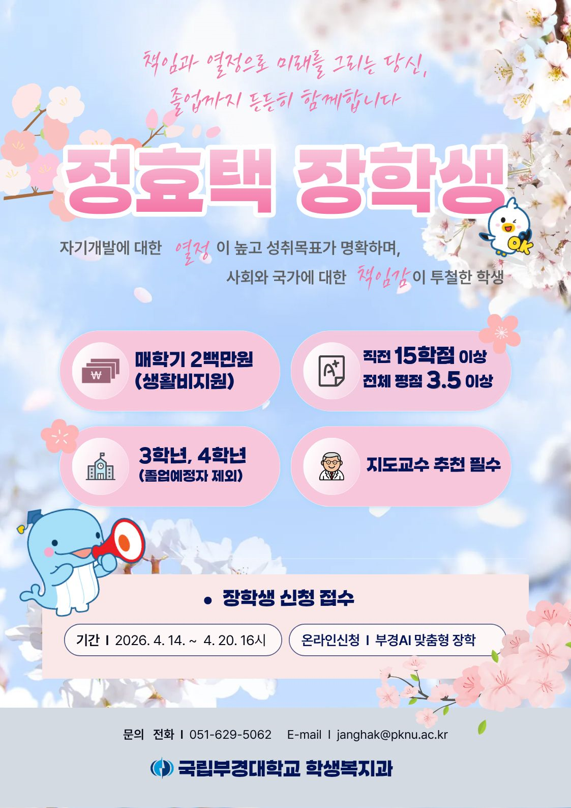 2026-1학기 [발전기금]정효택 장학생 선발 계획을 아래와 같이 안내드립니다. 가. 선발인원: 신규자 2명(계속지급자 제외) 나. 장학금: 학기당 2,000천원(생활보조금) ※ 단, 기타 교외장학금(국가장학금 제외)과 중복 불가 다. 지원자격: 2026학년도 1학기에 3학년 또는 4학년 재학생(2026년 8월 졸업예정자 제외)으로 직전학기 15학점 이상이수하고, 전체 평점평균 3.5점 이상이며, 지도교수 추천을 받은 자(건축학전공은 5학년 가능) 라. 신청기간: 2026. 4. 14.(화) ~ 4. 20.(월) 16:00 까지 마. 신청방법(부경AI맞춤형장학 온라인) - 부경포털시스템 로그인-주요서비스 맞춤형장학(아이콘)-해당장학 클릭 - 부경포털시스템 로그인-부경AI-맞춤형장학(추천or검색)-해당장학 클릭 ※ 신청서류는 순서대로 합쳐서 1개의 파일(PDF, 파일명‘정효택장학_학번_성명’)로 업로드 바. 지원자격, 제출서류, 심사방법 등 세부사항은 붙임 모집공고 참조
