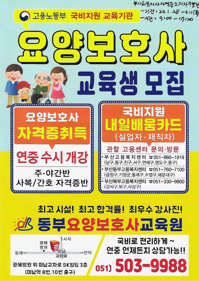 [사회복지학전공] 동부요양보호사교육원 요양보호사 교육생 모집