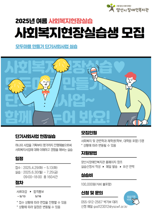 [실습생모집] 양산시장애인복지관 | 2025 하계 사회복지현장실습 실습생 모집(~5/13)